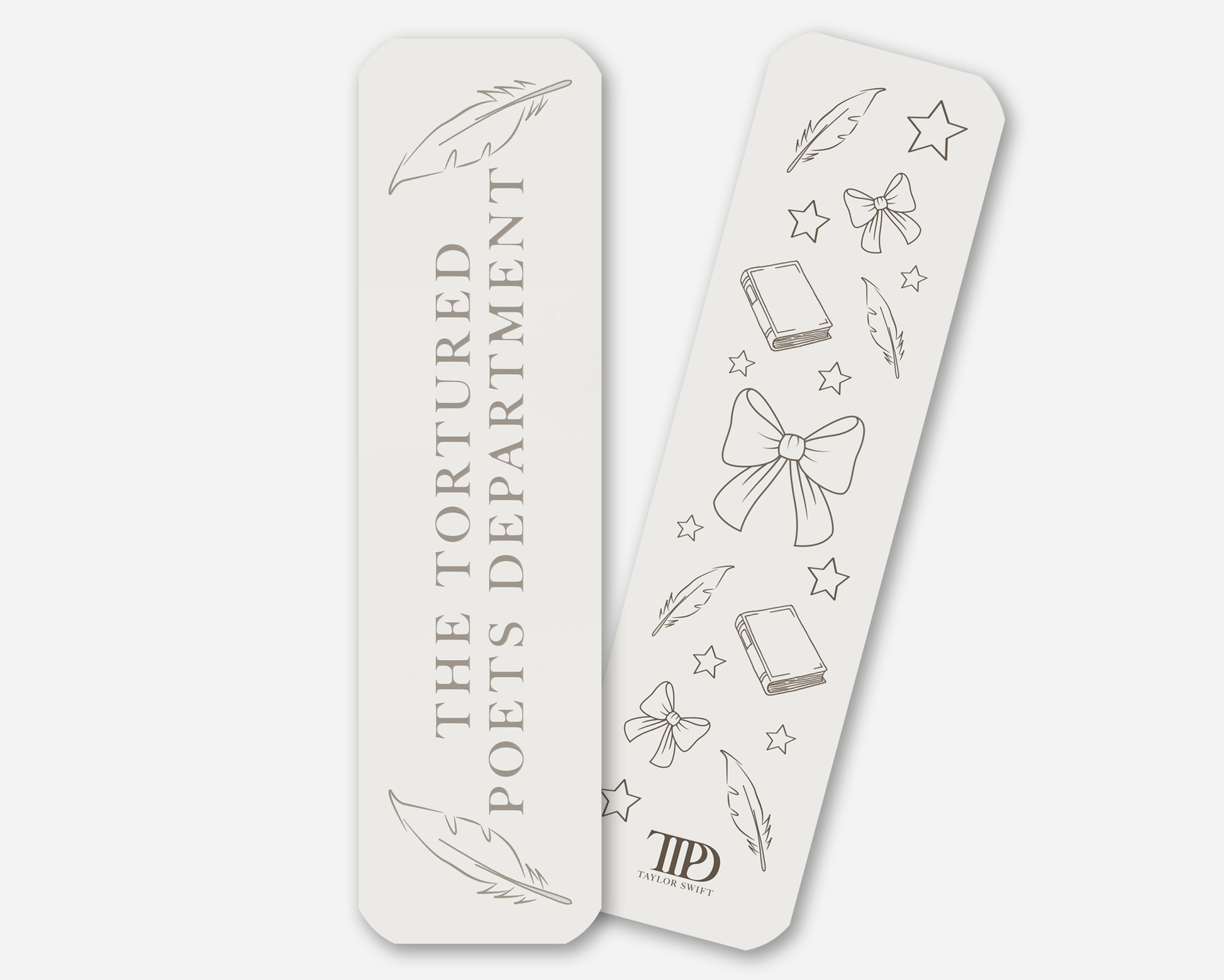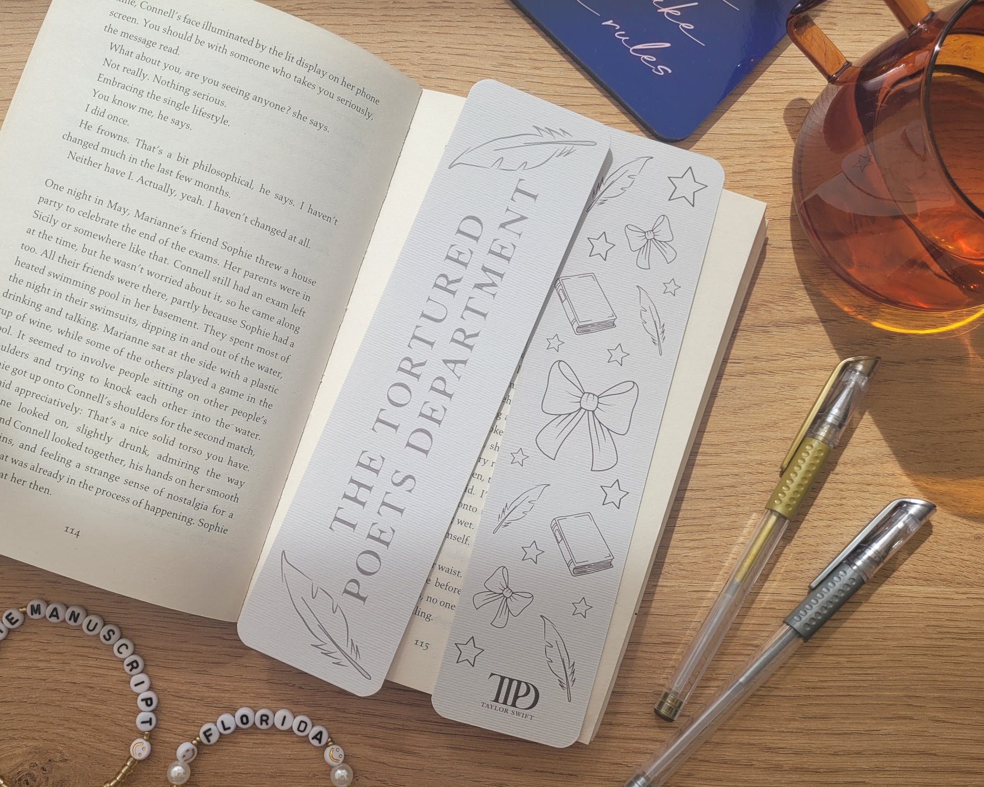 The bookmarks have designs on both sides as shown in the images. The front being The Tortured Poet Department, and the back featuring icons that represent the album.