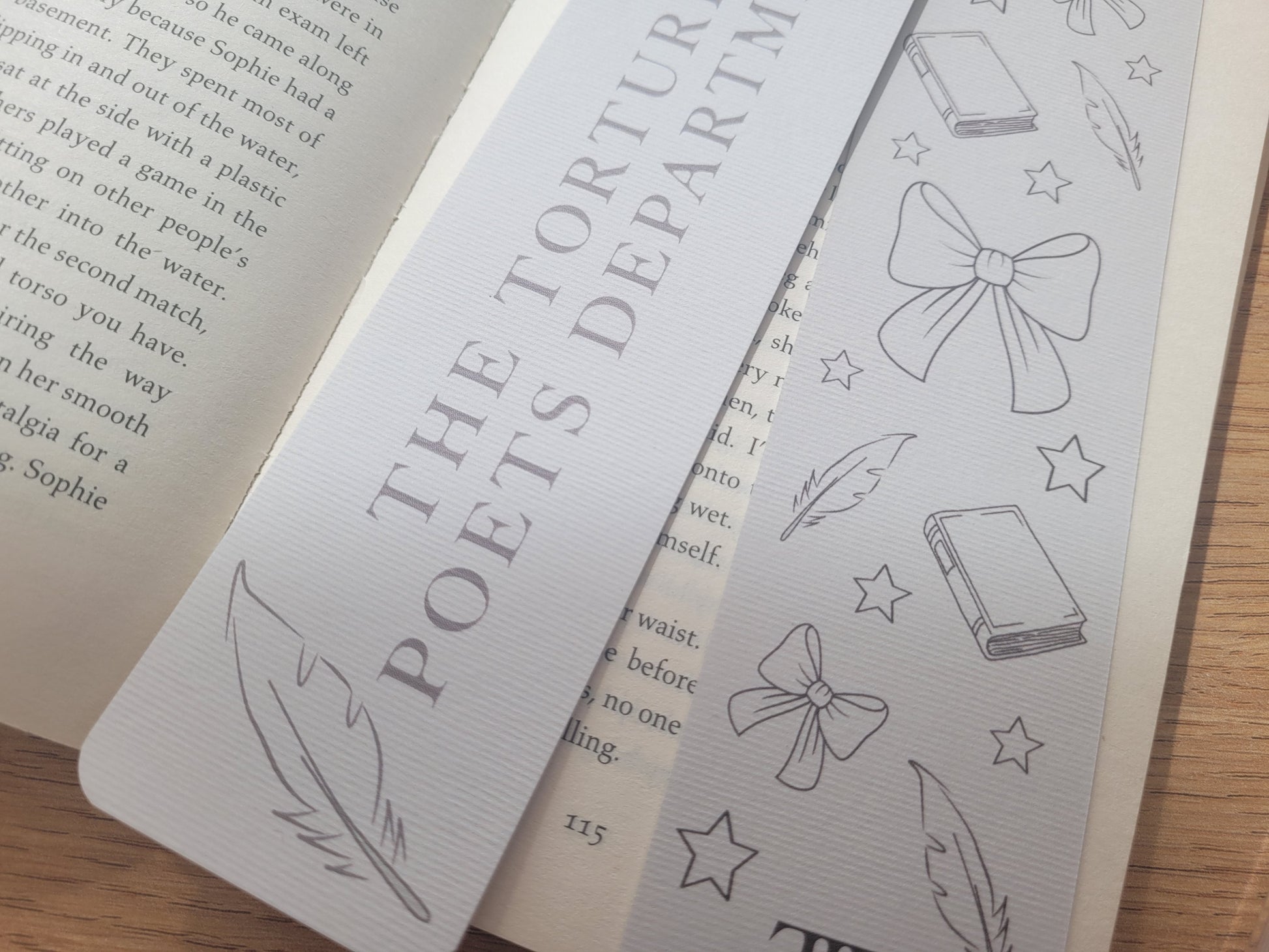 All bookmarks are printed on textured 280gsm paper, and are roughly 21cm x 5cm.
