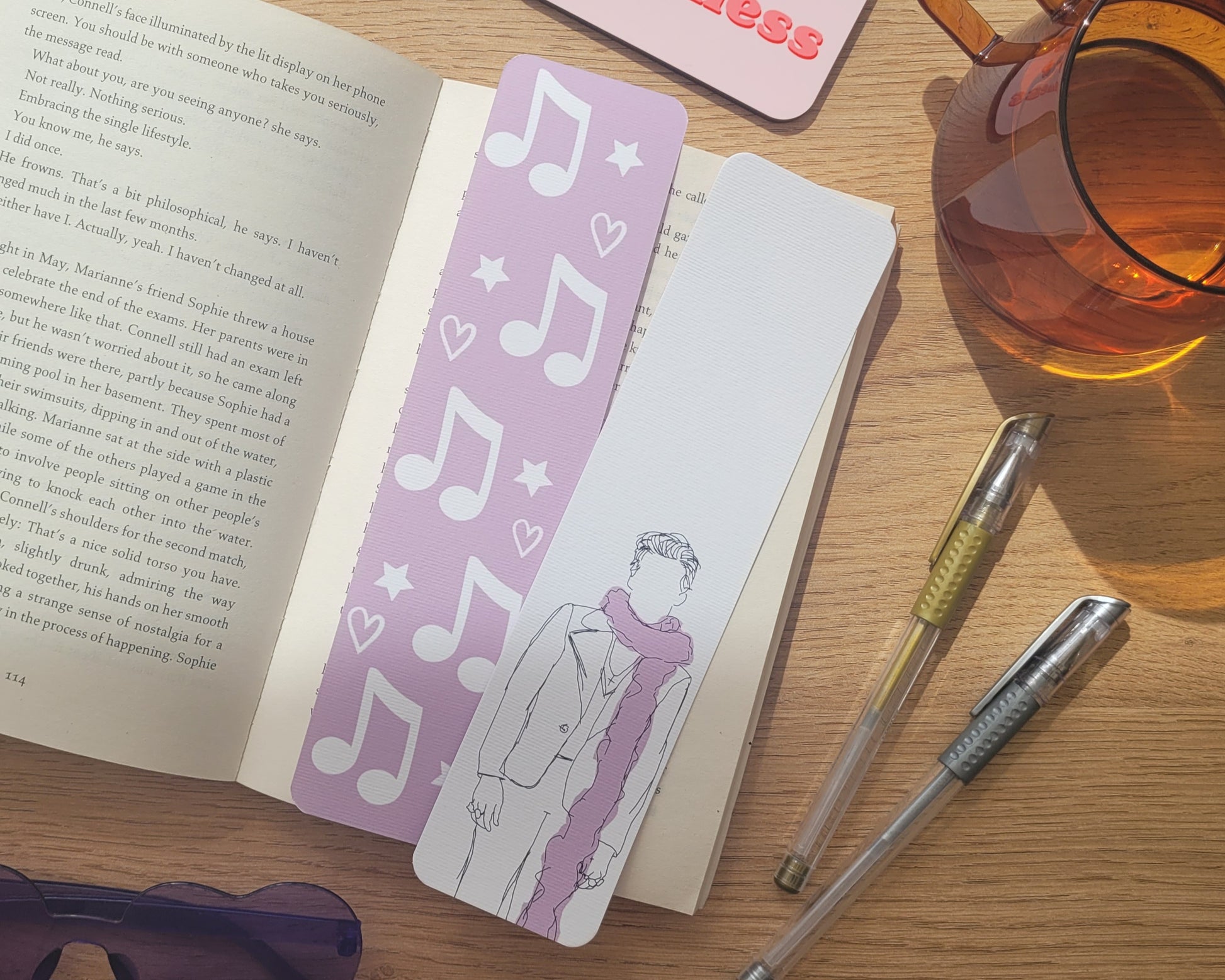 The bookmarks have designs on both sides as shown in the images. The front being a drawing of Harry Styles, and the back being music notes, hearts and stars.