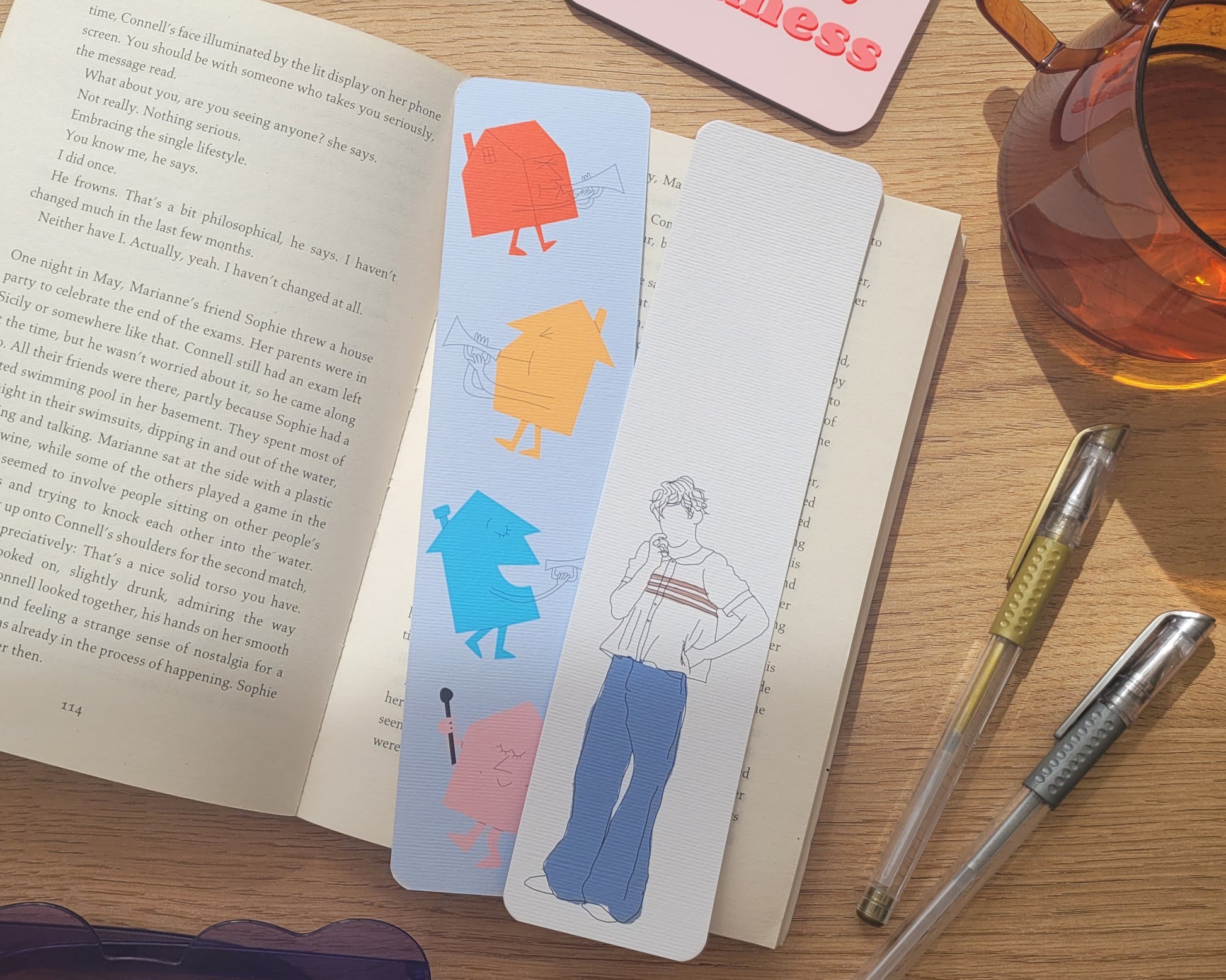 The bookmarks have designs on both sides as shown in the images. The front being a drawing of Harry Styles, and the back being the houses from love on tour.