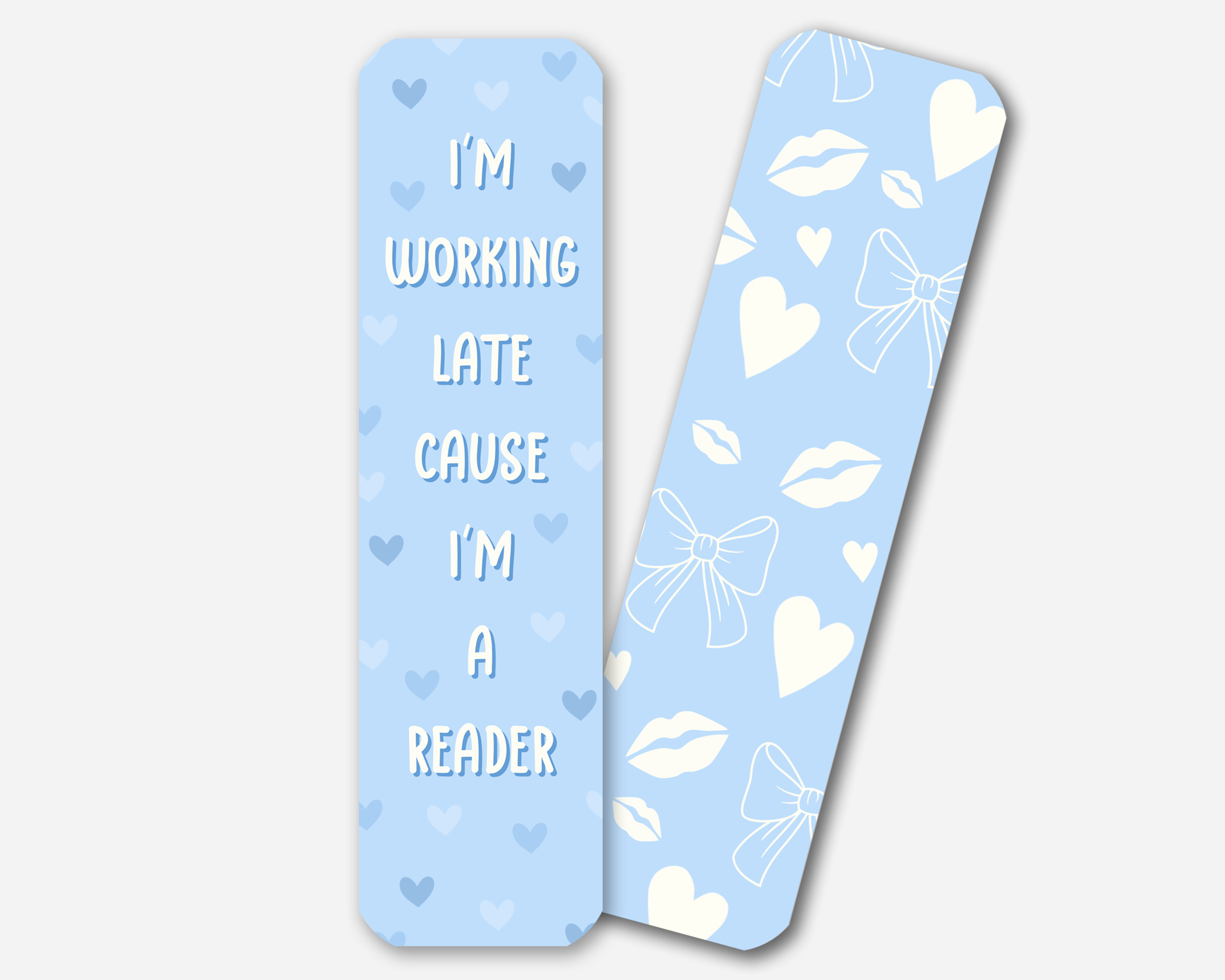 The bookmarks have designs on both sides as shown in the images. The front being a quote saying "I'm working late cause i'm a reader" inspired by Sabrina Carpenter lyrics, and the back being hearts, bows and lips.
