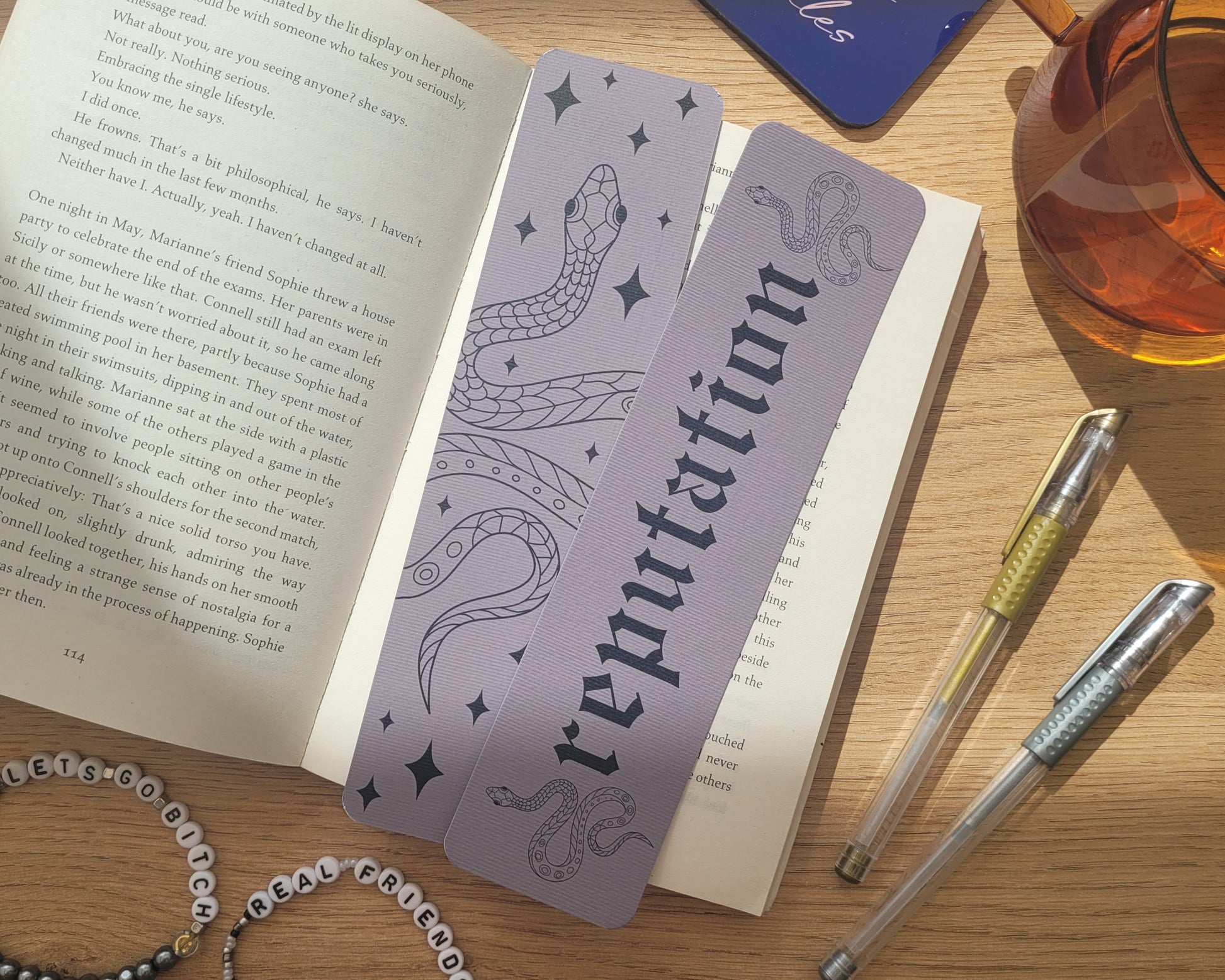 The bookmarks have designs on both sides as shown in the images. The front being Reputation, and the back featuring icons that represent the album.