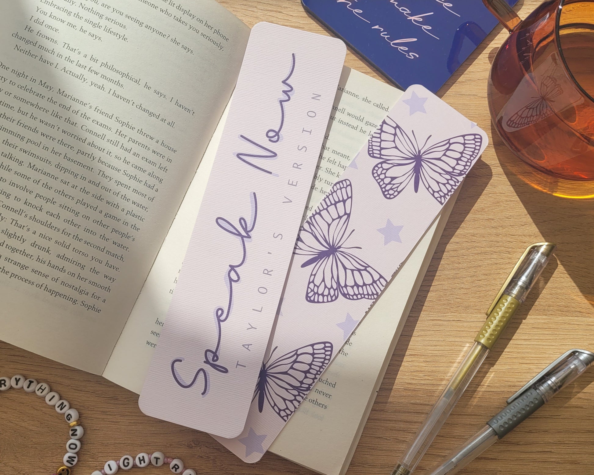 The bookmarks have designs on both sides as shown in the images. The front being Speak Now, and the back featuring icons that represent the album.