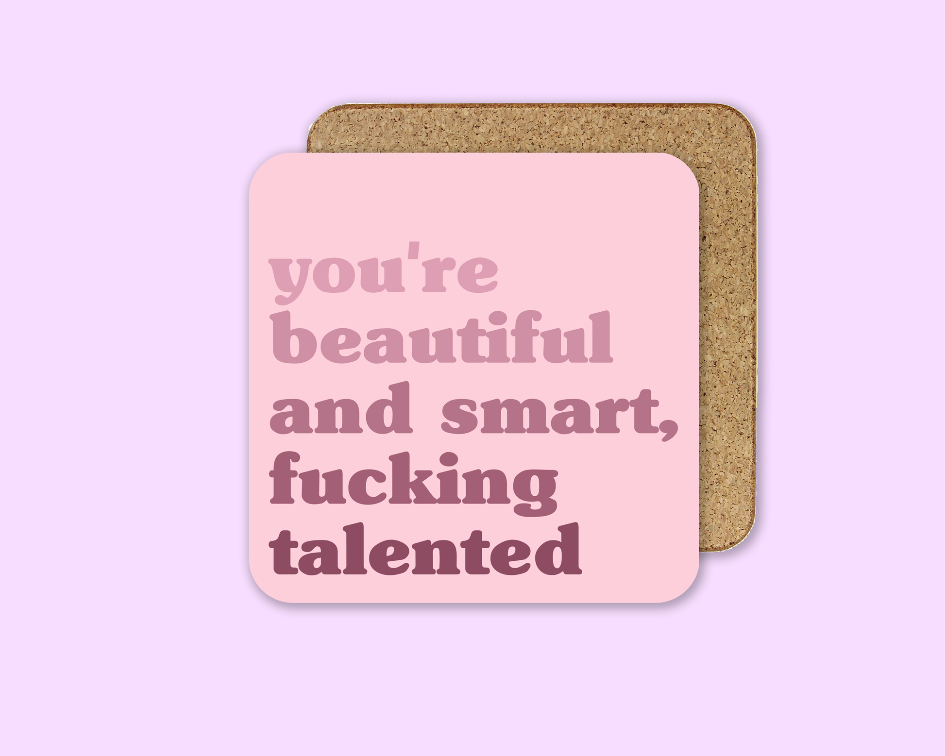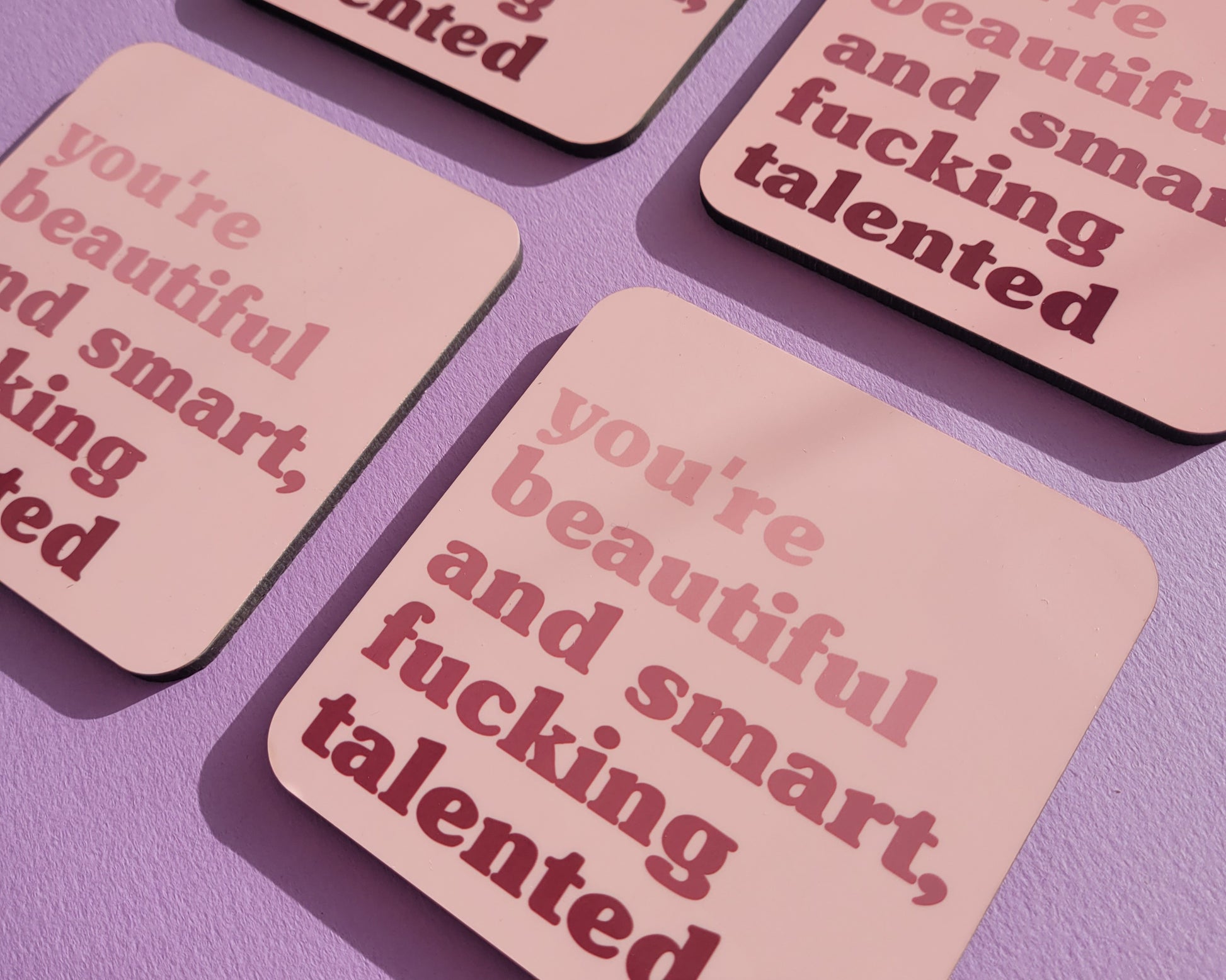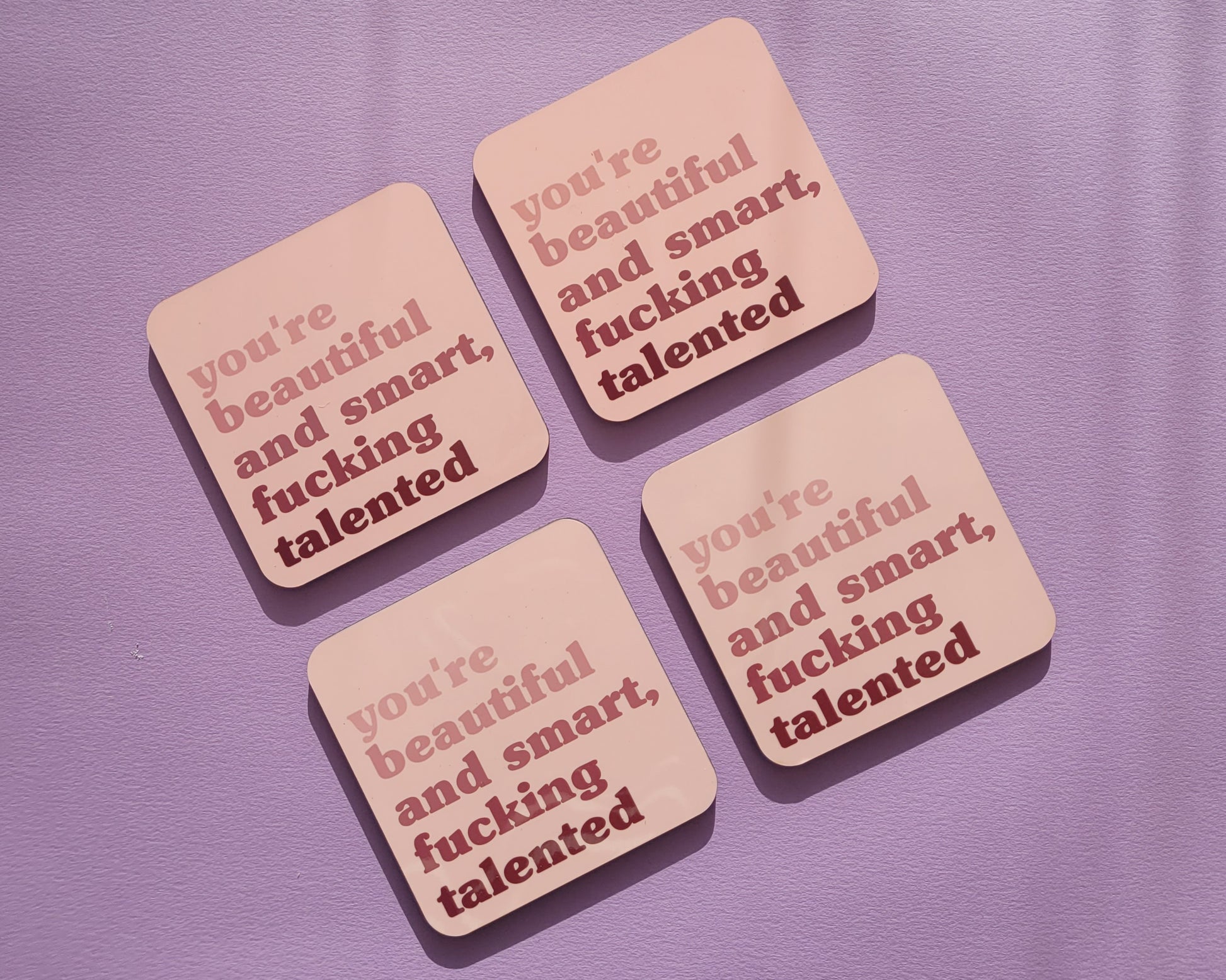 Introducing the "You're Beautiful and Smart, Fucking Talented" Coaster inspired by the empowering and uplifting spirit of Lizzo. This coaster not only serves as a functional piece for your beverage but also delivers a daily dose of confidence and positivity with its bold and empowering message.